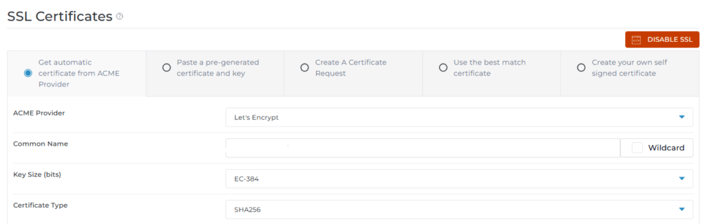 - On SSL Certificates page that opens, click on Get automatic certificate from ACME Provider tab.